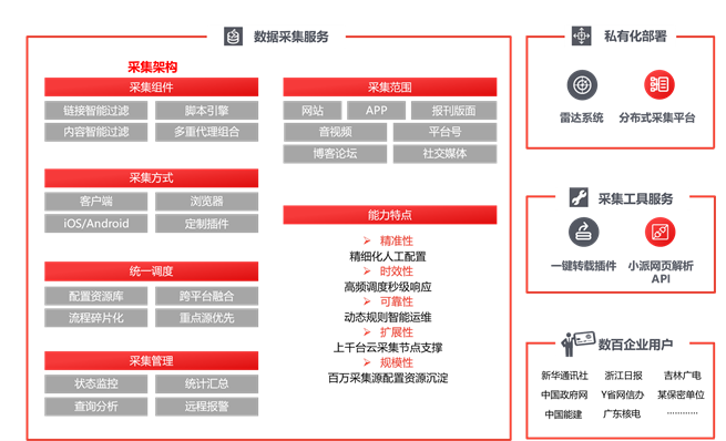 采集目標(biāo)范圍寬廣:包括新聞網(wǎng)頁(yè)、APP新聞以及APP推送消息、報(bào)刊版面、音視頻、自媒體平臺(tái)、博客論壇、國(guó)內(nèi)外各主流社交媒體等??刹杉喾N類信息:文本數(shù)據(jù)、互動(dòng)數(shù)據(jù)、賬戶數(shù)據(jù)、實(shí)體數(shù)據(jù)(音視頻、附件和圖片)采集,多種深度數(shù)據(jù)采集。