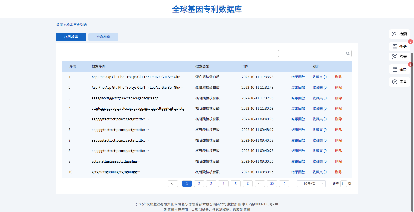 通過檢索歷史可進(jìn)行檢索追溯和分析。檢索歷史支持分別查看序列檢索和專利檢索的檢索歷史,支持結(jié)果回放、收藏和刪除功能。