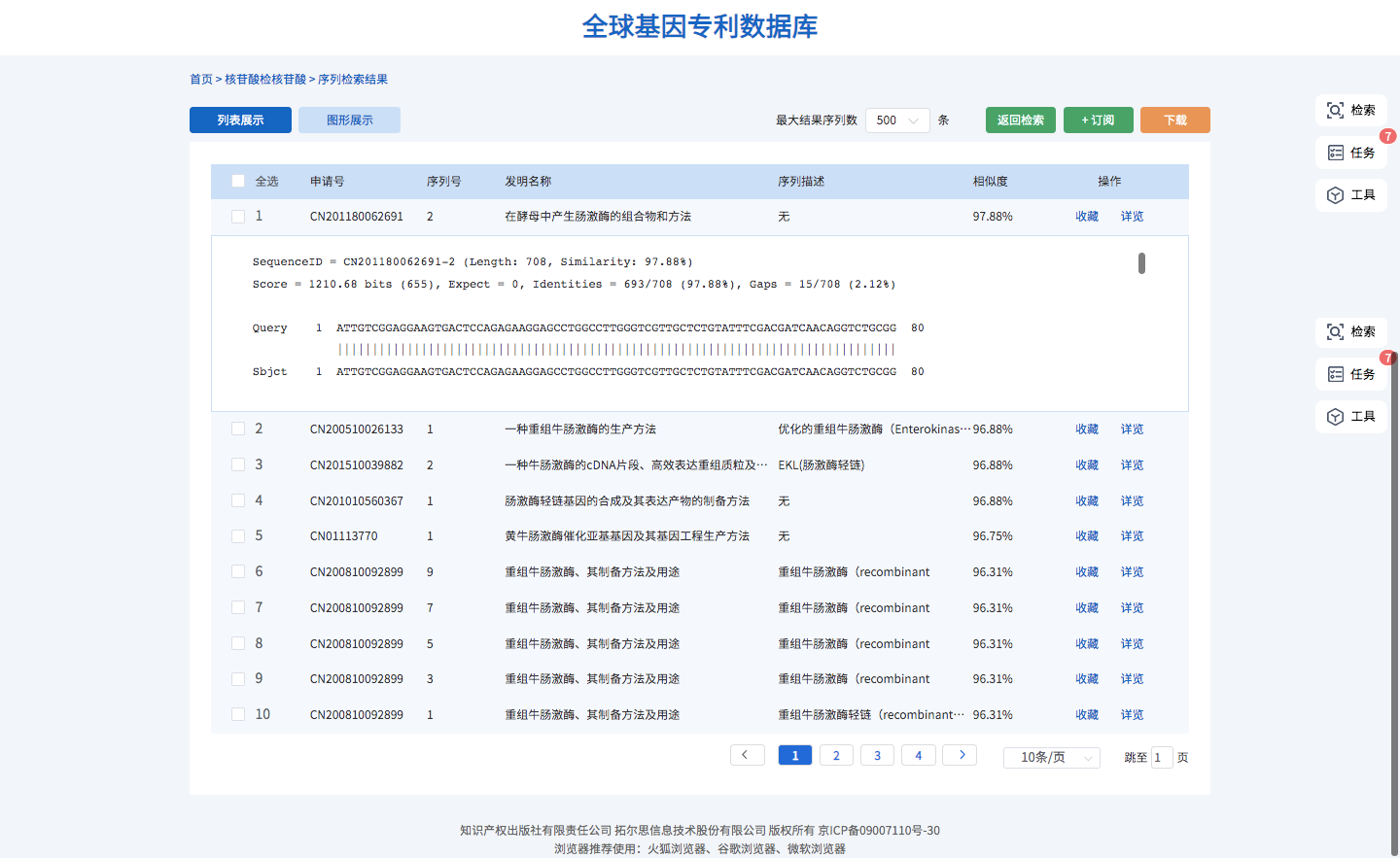 檢索結(jié)果展示序列相關(guān)專利的申請(qǐng)?zhí)?、序列?hào)、發(fā)明名稱、序列描述、相似度信息,支持序列專利詳覽查看、序列收藏、圖形展示和目標(biāo)序列下載;支持檢索條件一鍵訂閱,方便跟蹤目標(biāo)序列的最新數(shù)據(jù)動(dòng)態(tài)。