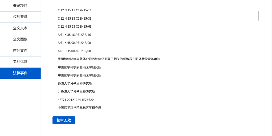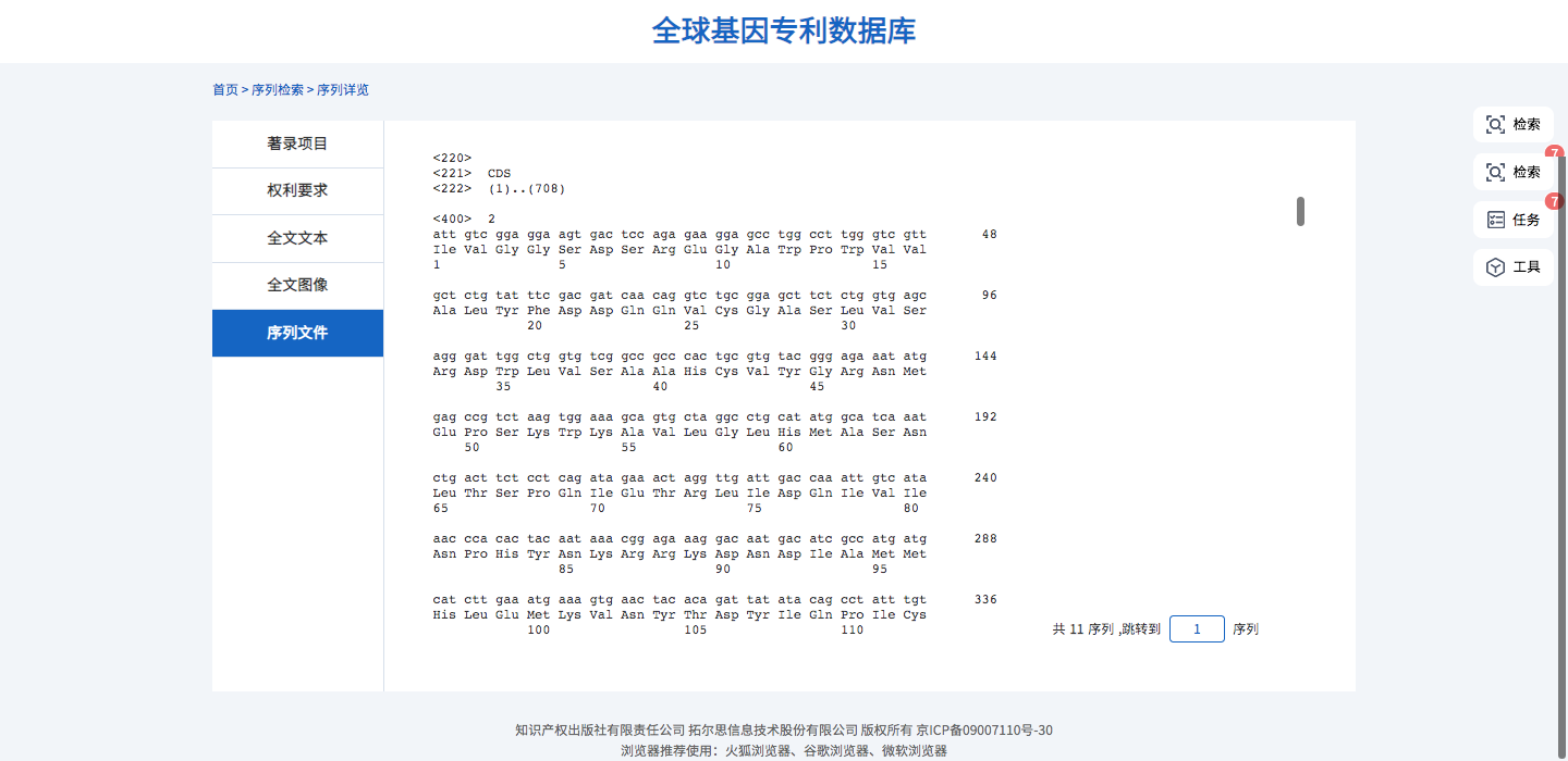 序列詳覽提供基因?qū)@涰?xiàng)目、權(quán)利要求、說明書、專利全文PDF以及序列文件、運(yùn)營數(shù)據(jù)和法律事件信息的查看。