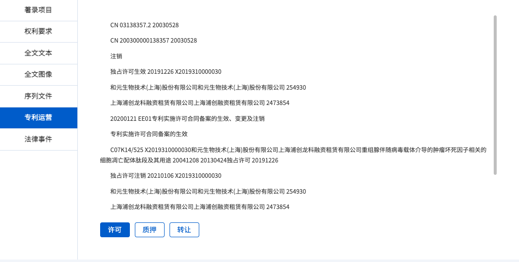 專利運(yùn)營數(shù)據(jù):許可/質(zhì)押/轉(zhuǎn)讓信息查看
