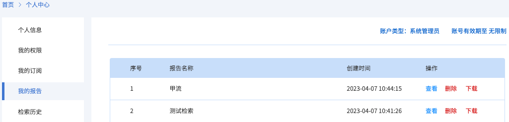 個(gè)人中心-我的報(bào)告中,可以查看所有檢索報(bào)告,可對(duì)檢索報(bào)告進(jìn)行查看/刪除/下載,等操作