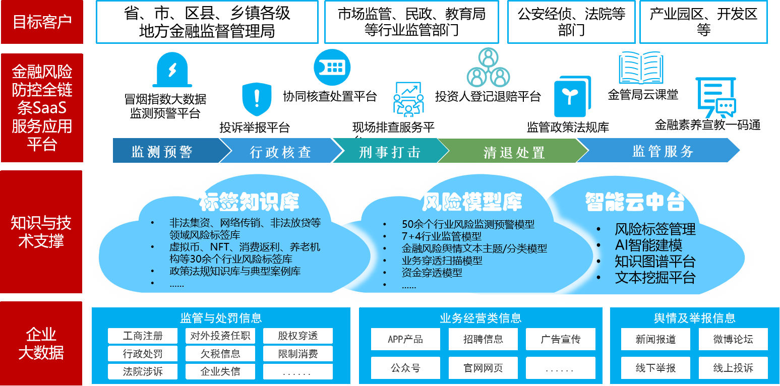 冒煙指數(shù)聚焦地方金融風(fēng)險防控,基于對企業(yè)大數(shù)據(jù)的采集、分析,金融風(fēng)險特征提取、標(biāo)注,預(yù)警模型搭建,及對“主動監(jiān)測-分級預(yù)警-量化分析-核查化解-分類處置”全業(yè)務(wù)流程的梳理研究,形成金融風(fēng)險防控全鏈條產(chǎn)品體系,致力于運(yùn)用監(jiān)管科技為地方金融監(jiān)管局、公安經(jīng)偵、行業(yè)主(監(jiān))管等部門賦能,創(chuàng)新監(jiān)管思維方法、提升數(shù)字化監(jiān)管能力。