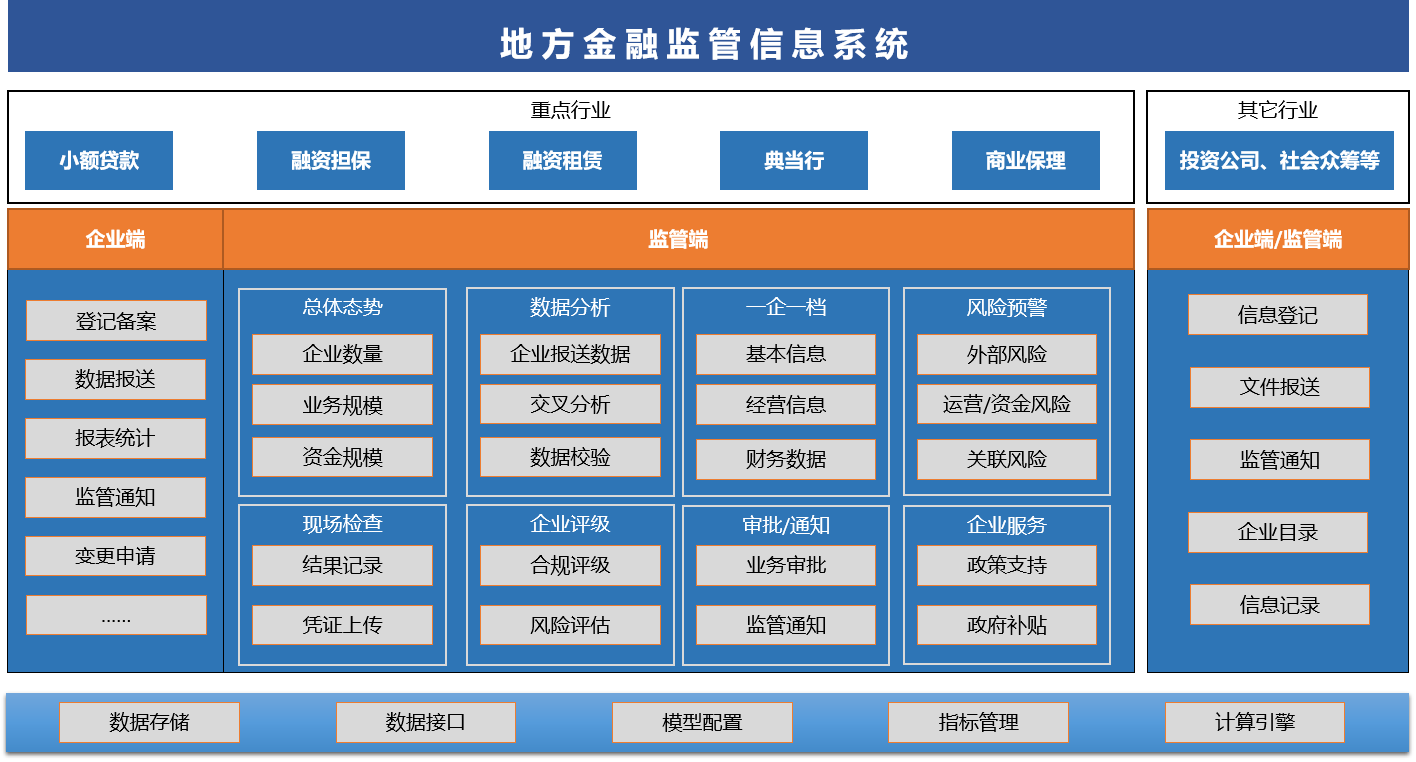 地方金融監(jiān)管信息系統(tǒng)支持地方金融組織在線上報業(yè)務(wù)數(shù)據(jù),同時系統(tǒng)采集各類企業(yè)公開數(shù)據(jù),擴(kuò)充監(jiān)管數(shù)據(jù)源,與機(jī)構(gòu)報送數(shù)據(jù)實現(xiàn)自動交叉驗證,確認(rèn)信息真實有效性;系統(tǒng)利用大數(shù)據(jù)、人工智能等先進(jìn)技術(shù),結(jié)合知識圖譜和數(shù)據(jù)分析建模能力,分行業(yè)建立預(yù)警指標(biāo)、構(gòu)建企業(yè)信用畫像,輔助地方金融監(jiān)管局對地方金融機(jī)構(gòu)運(yùn)行狀況、行業(yè)發(fā)展?fàn)顩r進(jìn)行實時動態(tài)監(jiān)測和綜合統(tǒng)計分析,對登記、備案、注銷、退出進(jìn)行全流程監(jiān)控,實現(xiàn)金融行業(yè)治理的智能穿透式監(jiān)管。