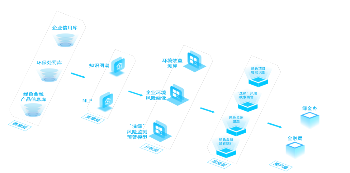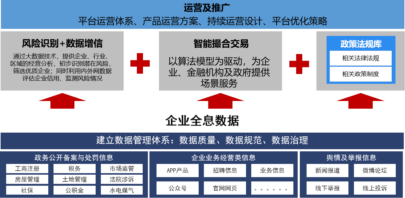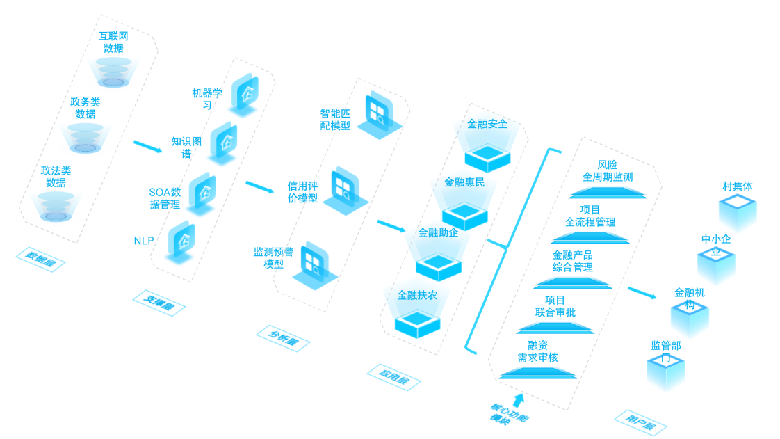 基于政務(wù)、企業(yè)上報、公開數(shù)據(jù)采集,應(yīng)用大數(shù)據(jù)、人工智能、加密算等技術(shù),搭建政府、 金融機(jī)構(gòu)、企業(yè)三者之間的服務(wù)平臺,為政府、金融機(jī)構(gòu)和中小微企業(yè)提供綜合性的智能化融資服務(wù),化解中小企業(yè)融資難題。